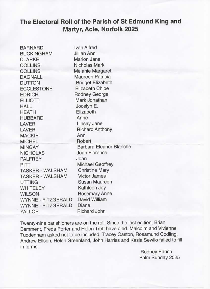New church Electoral Rolls are being prepared for all parishes, with an application deadline of Sun 13th April: these may be posted here as well.